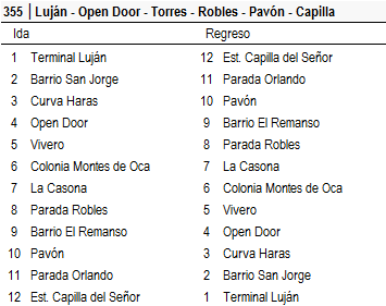 De Terminal de Ómnibus de Luján por Dr.Real, Av.Nuestra Sra.de Luján, 25 de Mayo, Francia, Ituzaingó, Av.Humberto 1º, Av Carlos Pellegrini RP7, Ruta Prov.7 (egreso de Luján), Ruta Prov.7, Ruta Prov.47 ex 192, Juan de Dios Filiberto (ingreso a Open Door), Av.Dr.D.Cabred (Est.Dr.D.Cabred, egreso de Open Door), Acceso a Open Door, Ruta Prov.47 ex 192 (ingreso a Torres), Nemesio Litardo (Est.Torres), Padre J.M.Criado Alonso, Acceso Colonia Montes de Oca, Ruta Prov.47 ex 192 (egreso de Torres, Barrio Mateo, ingreso a Parada Robles), Rotonda Autopista Ruta Nac.8, Ruta Prov.47 ex 192, Acceso Pda Robles ex Ruta Nac.8 (egreso de Parada Robles), Ruta Nac.8 (Barrio El Remanso, Barrio Los Pinos), Autopista Ruta Nac.8, Rotonda Barrio Sakura, Ruta Prov.39 (Pavón, Parada Orlando, ingreso a Capilla del Señor), Ameghino, L.M.Migliaro, Parada Robles, San Martín, Terminal Capilla del Señor (Est.Capilla del Señor). |